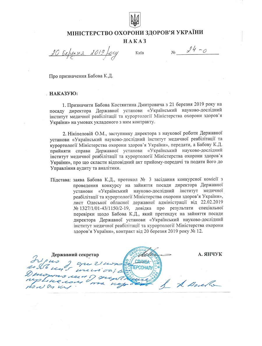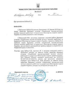 Призначення на посаду директора Наказом Міністерства охорони здоров’я України від 20 березня 2019 року № 24-о Бабова Костянтина Дмитровича призначено на посаду директора Державної установи «Український науково-дослідний інститут медичної реабілітації та курортології МОЗ України».